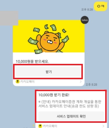 메시지가 도착합니다. 들어가보니, [10,000원을 받으세요] 라는 문구가 보입니다. [받기]를 클릭해서 냉큼 돈을 받아냅니다.