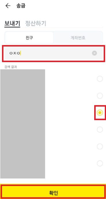 자, [송금] 메뉴를 선택한 다음에는 수신자를 지정해주어야 합니다. 제가 보낼 친구 이름의 자음만 검색해서 찾는 모습입니다. 검색창에 저렇게 ㅇㅈㅇ 입력하고 제가 보낼 돈을 받을 친구를 선택하면, 노란색 동그라미로 표시됩니다.