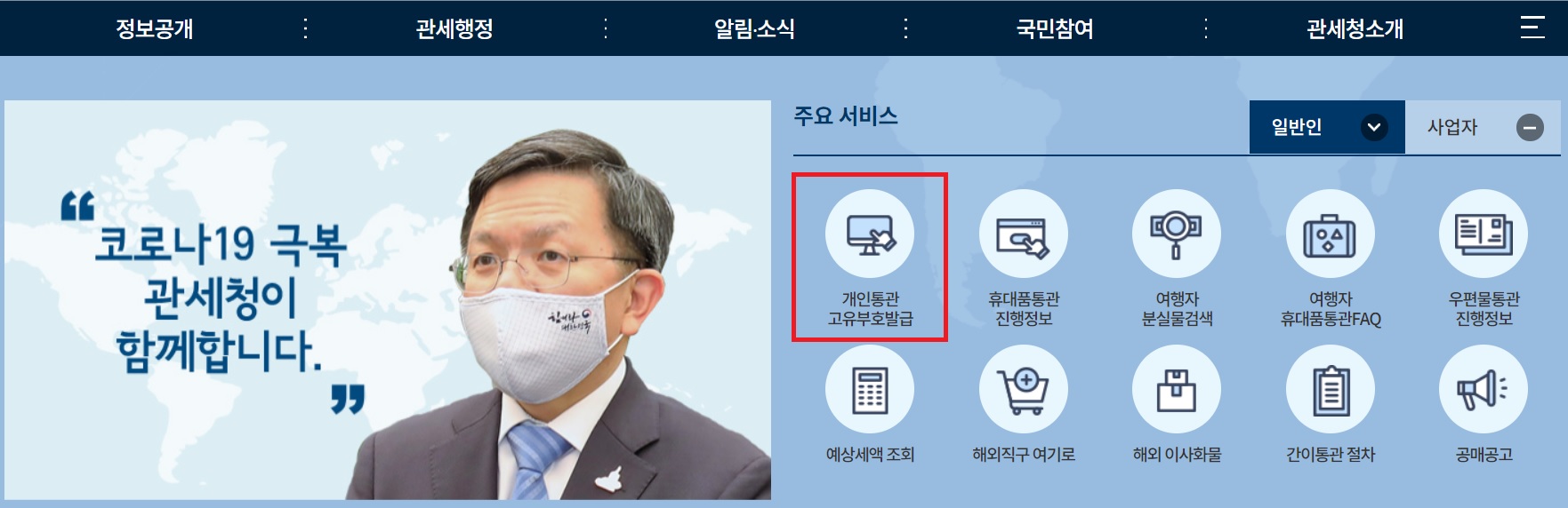 먼저 개인통관고유번호를 담당하는 기관 관세청 홈페이지를 접속하도록 하겠습니다. 포털에 입력하셔서 가장 상위에 조회되는 사이트로 접속하시면 빠르기도 합니다.