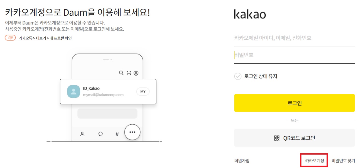먼저 포털사이트를 다음으로 이동해봅니다. 다음이 홈이시면 우측에 [카카오계정으로 로그인] 메뉴가 있습니다. 클릭해볼께요.