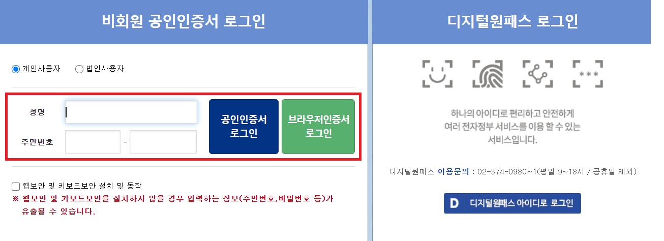 비회원 공인인증서 로그인 / 디지털원패스 로그인