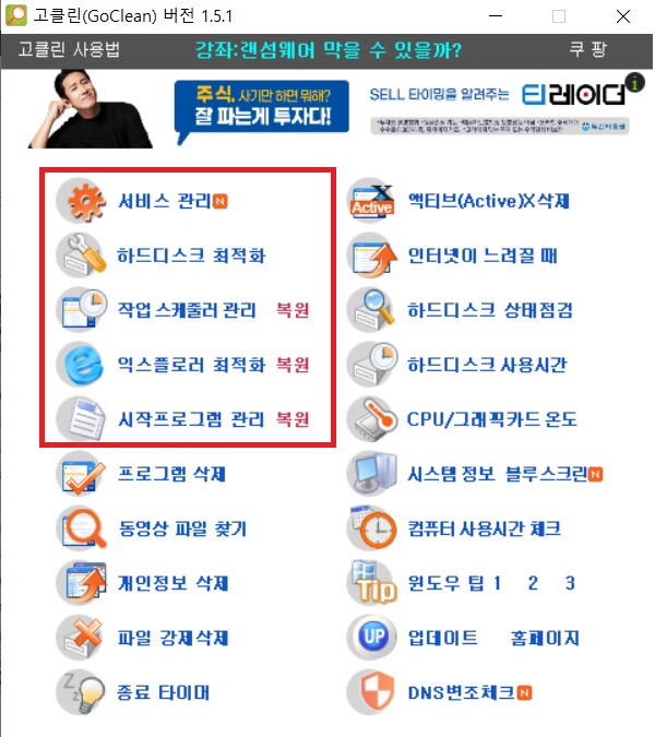 고클린 어플리케이션은 시스템 최적화를 해주는 프로그램으로 매우 인기많은 어플리케이션입니다. 여러가지 메뉴들이 있지만 인터넷 창이 여러개 열리는 문제해결을 하기 위해서 아래 붉은 테두리로 표시한 메뉴들을 순차적으로 이용해서 문제를 해결할 수 있습니다.