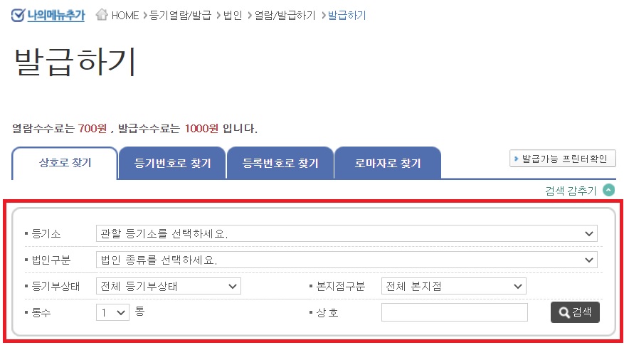 열람 수수료는 700원, 그리고 발급하려면 수수료는 1,000원의 비용이 듭니다. 위와 같이 정보를 입력하고 검색하시면 해당등기를 조회하실 수 있으며 발급받으실수 있습니다.