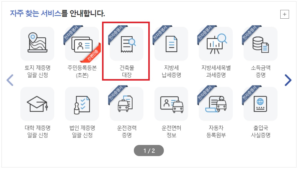위와 같은 주소로 페이지 이동을 하신 뒤 하단을 보시면 [자주 찾는 서비스]가 보입니다. 1면에 보이는 메뉴가 12개 이고 뒷면까지 있는걸 보니 정부24 홈페이지에서는 정말 많은 서비스가 가능하다는점 알 수 있습니다. 우리는 그 중에서 건축물대장을 열람하기 위해서 접속했는데요. 위치는 1면의 3번째에 위치하고 있습니다.