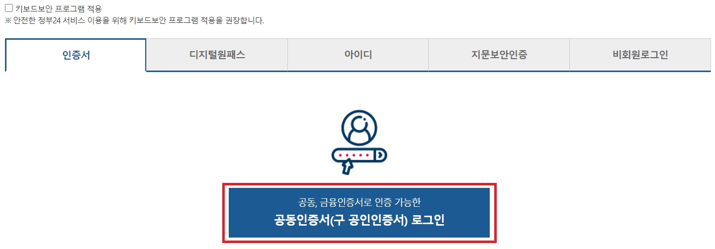 정부24는 다양한 방법으로 로그인 할 수 있습니다. 인증서, 디지털원패스, 아이디, 지문보안인증 그리고 비회원으로 로그인도 가능합니다. 저는 공동인증서로 로그인 하는게 가장 편리해서 이것으로 진행합니다
