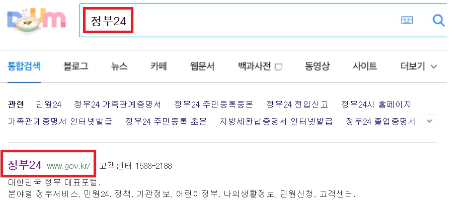 다음 홈페이지에서 정부24 를 검색합니다. 민원24 라고 예전 이름을 검색해도 똑같이 조회가 되니 편하신 방법으로 조회해서 사이트로 접속하겠습니다. 최근에 많이 들어가는것 같네요