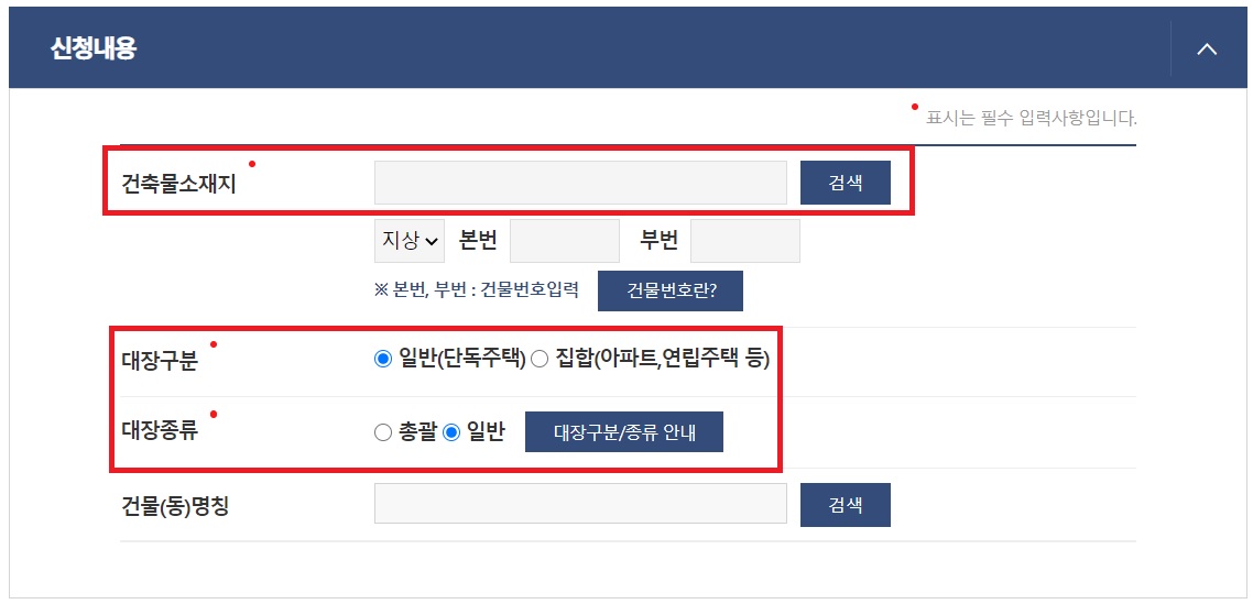 로그인을 하신 다음 건축물대장 열람 및 발급하기 메뉴에 다시 들어오시면 아래와 같이 신청내용을 적는 칸이 나옵니다. 건출물소재지, 대장구분, 대장종류 등의 빨간점이 표시되어 있는 부분을 필수적으로 입력해주시고 마지막으로 수령방법에서 온라인으로 선택해주시면 끝.