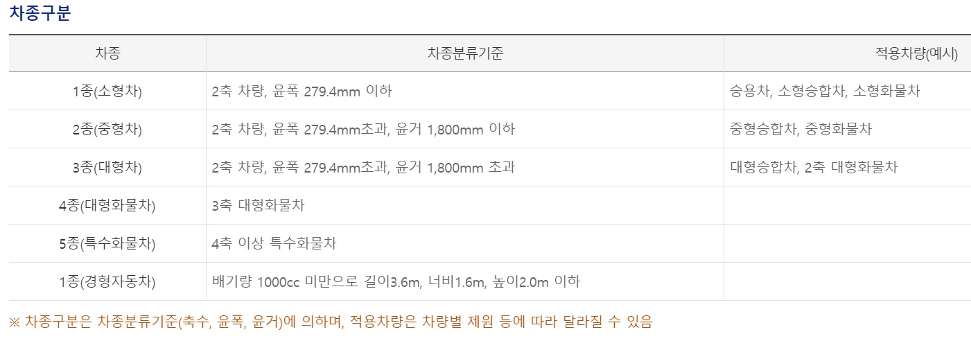 혹시나 본인이 운전하는 차종이 헷갈리신다면 아래 표를 참고하시면 도움될 거 같습니다. 네 저는 승용차라서 1종인 부분을 확실하게 확인하였습니다. 고속도로에서는 이렇게 차종별로 요금이 상이한점 다시 한번 조회가 가능합니다.