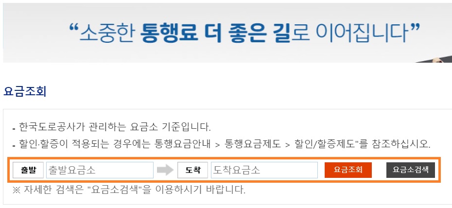 네, 위와 같이 사이트에 잘 접속하셨으면 밑에 같은 화면을 바로 나오실텐데요. 출발하는 장소와 도착하는 장소를 정해서 요금조회가 가능하게 되어 있습니다.