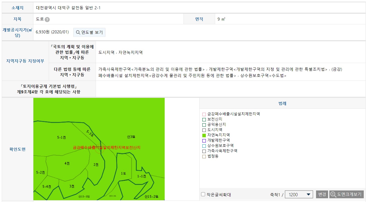 저는 토지정보 무료로 열람하는 방법을 설명드리기 위해서 임의로 대전광역시 대덕구 갈전동 2-1 주소를 예를 들어 열람해보았습니다. 그럼 내용을 확인해보겠습니다.