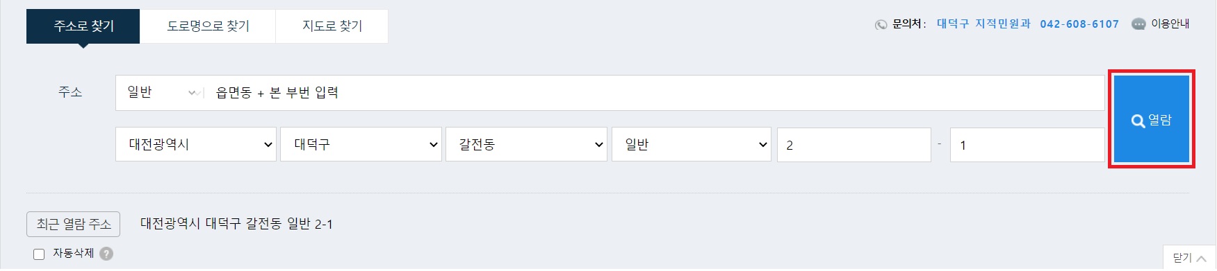 홈페이지를 접속하시면 가장 메인이 화면과 동일한 부분입니다. 주소로 찾기, 도로명으로 찾기, 지도로 찾기 총 3가지 방법이 있습니다. 저는 가장 익숙한 주소로 찾기로 예를 들어보겠습니다.
