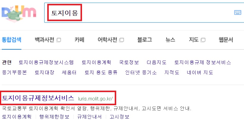 먼저 포털에 저처럼 [토지 이용] 이렇게 검색하면 됩니다. 그럼 토지이용규제정보서비스 홈페이지 링크가 조회됩니다. 그럼 들어가봅니다.