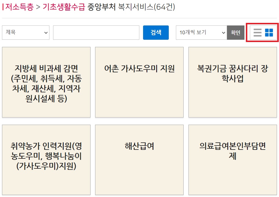 오른쪽에 표시된 사각형이 4개로 나누어진 박스를 선택하면 아래처럼 한눈에 보기 쉽게 나열되게 혜택을 보실수도 있습니다. 기초생활수급자인 경우에 혜택은 총 64건으로 한번에 보시기에는 힘들고 스크롤을 내려서 하나하나 찾아보시면 되겠습니다. 아니면 제목 검색창에 단어나 문장을 입력해서 해당 복지를 검색하는 방법도 있습니다.