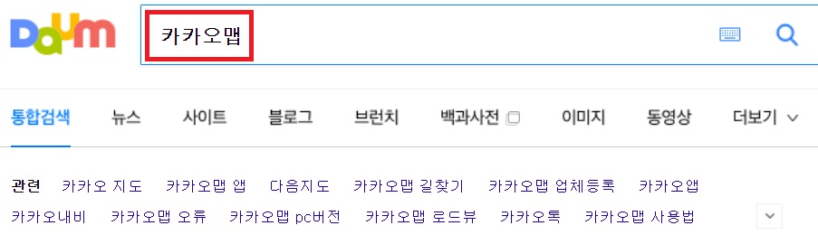 다음 포털사이트에서 카카오맵을 검색해보겠습니다. 여러가지 관련 검색어들이 나열되는 것을 볼 수 있지만 우리가 들어가야 할 곳은 바로 알 수가 있습니다. 여러분들의 센스를 믿습니다.