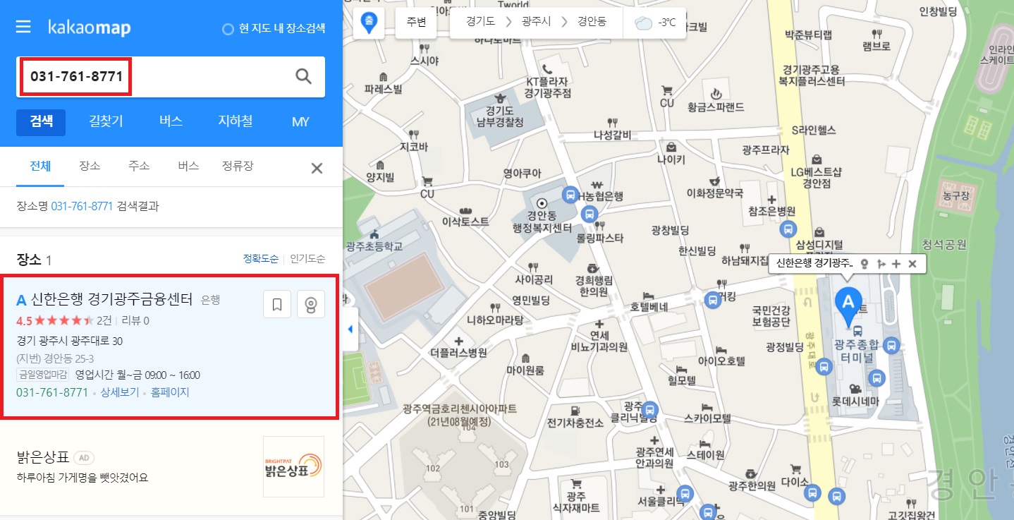 위에서 알려드린 칸에다가 [전화번호]를 입력해보겠습니다. 그리고 오른쪽에 [돋보기] 버튼을 클릭해주시면, 와우 대박 신한은행 경기광주 금융센터 주소가 나와버립니다. 우측에는 지도에도 자세하게 표시되고, 좌측 하단에는 사업소의 자세한 정보가 조회됩니다.
