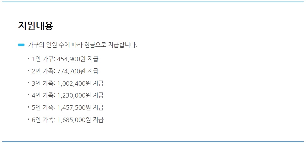 그렇다면 지원금액은 어떻게 되는지 알아보겠습니다. 긴급생계비 지원제도는 해당 가구의 인원 수에 따라서 지급되는 금액이 달라지게 되는데 1인 가구인 경우네는 454,900원 / 2인인 경우는 774,700원입니다. 6인 가족에 해당하는 상황에는 1,685,000원이 지급되겠습니다.