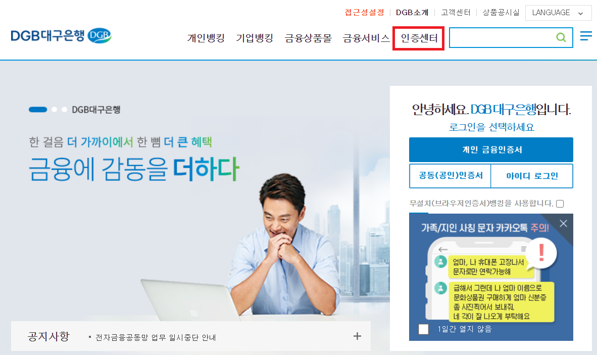 DGB대구은행 마크의 색처럼 파란색과 초록색이 잘 조회되어 있습니다. 공인인증센터도 파란색과 초록색으로 이루어졌는지 들어가봅니다. 인증센터 메뉴는 상단 5번째에 있습니다.