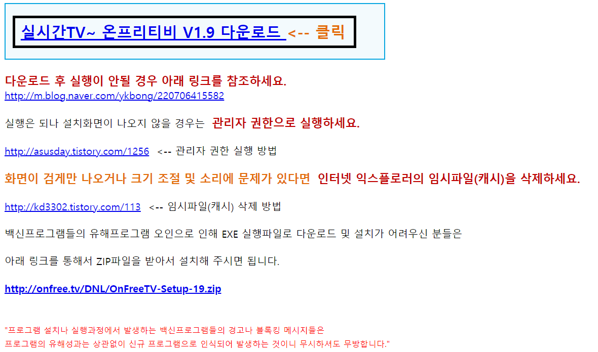 위에서 사이트 바로가기를 선택하셔서 이동하시면 아래 사이트로 페이지를 이동할 수 있습니다. 스크롤을 조금 더 내리면 아래 화면이 나오는데, [실시간TV ~ 온프리티비 V1.9 다운로드] 문구를 선택하시면 온프리티비를 이용하실 수 있겠습니다.