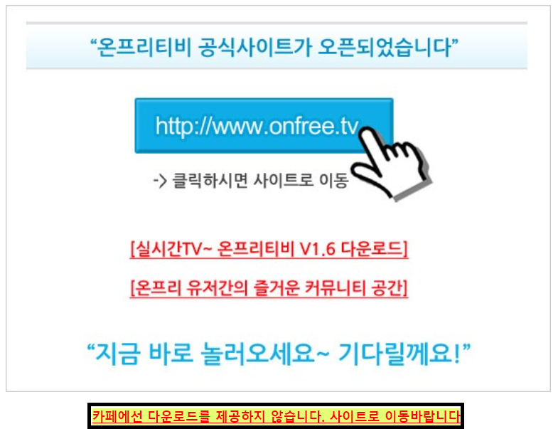 실시간tv 방송으로 매우 유명한 사이트입니다. 이 온프리를 이용하는 방법을 간략하게 설명드립니다. 먼저 카페에 접속하시면 메인 배너 하단에, 사이트로 이동하라는 문구가 있습니다. 따라서 이동해보겠습니다.